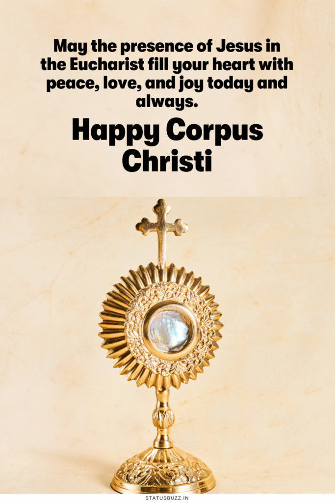 • Happy Corpus Christi Day! May the presence of Jesus in the Eucharist fill your heart with peace, love, and joy today and always.